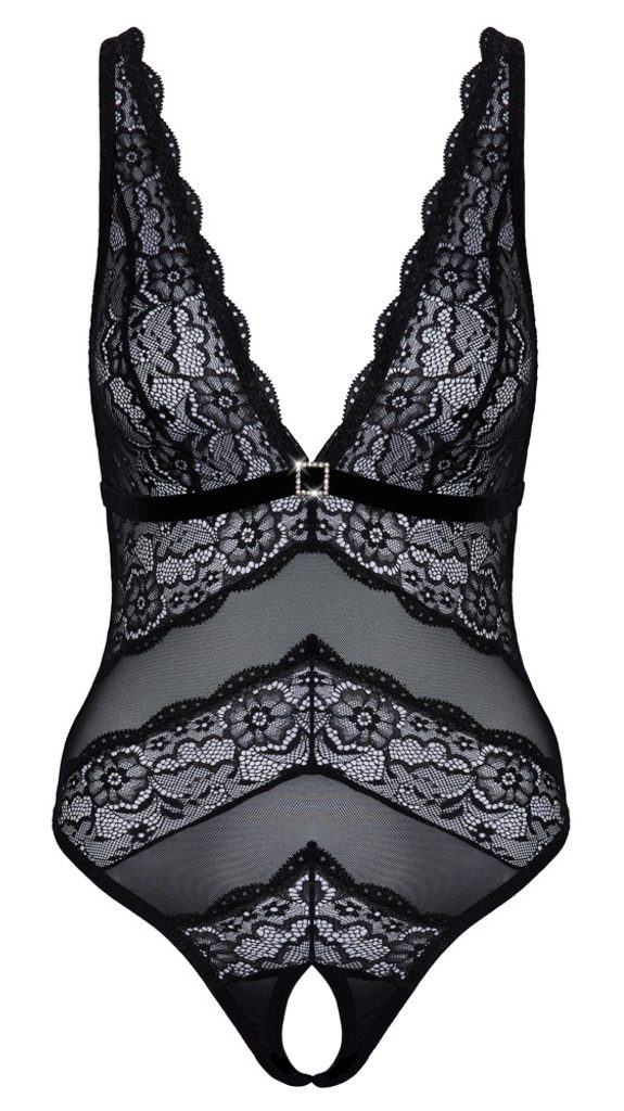 Body s otevřeným rozkrokem od Cottelli LINGERIE z jemné kombinace powernetu a květinové krajky. S krásně hlubokým výstřihem. Pod sametovým podprsním pásem se třpytí ozdobný prvek s kamínky. Rozkrok je svůdně otevřený. Zadní část z powernetu s nastavitelným zapínáním na háčky. Ramínka jsou také nastavitelná pro dokonalé přizpůsobení.