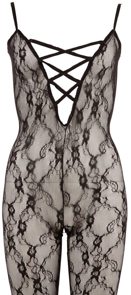 Černý catsuit z jemné vzorované krajkové látky s hlubokým výstřihem na zádech. Otevřený rozkrok. S částí na chodidla. 100 % polyamid.
