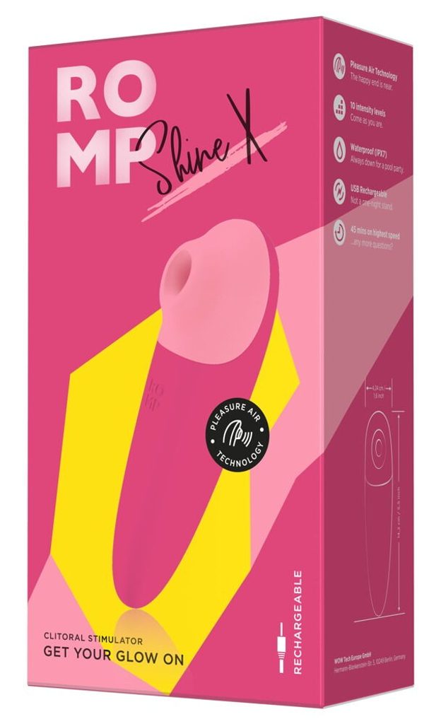 Pro intenzivní orgasmus během okamžiku! Praktický Shine X od ROMP s technologií Pleasure Air pro intenzivní orgasmy v co nejkratším čase. Pulzující vibrace vzduchu v 10 intenzitách stimulují klitoris zcela bezkontaktně - aniž by si na to zvykal nebo se cítil přestimulován. Dokonce i ve vaně a sprše, protože je voděodolný.