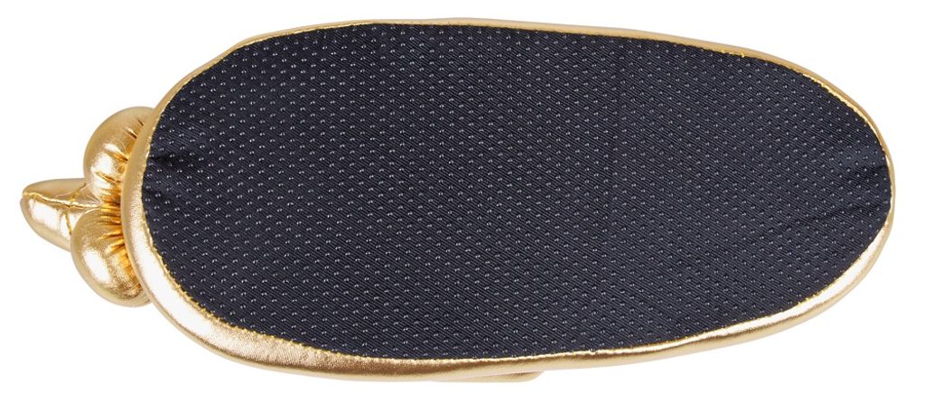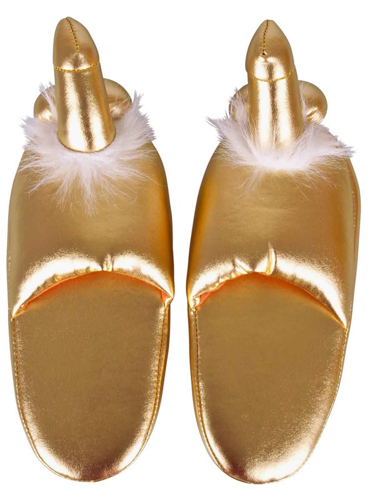 Zlaté pantofle z měkkého materiálu s penisem a varlaty na špičce každého pantofle. Standardní velikost: cca 37 až 43. Materiál: svrchní část 100 % polyester, podšívka 100 % polypropylen.
