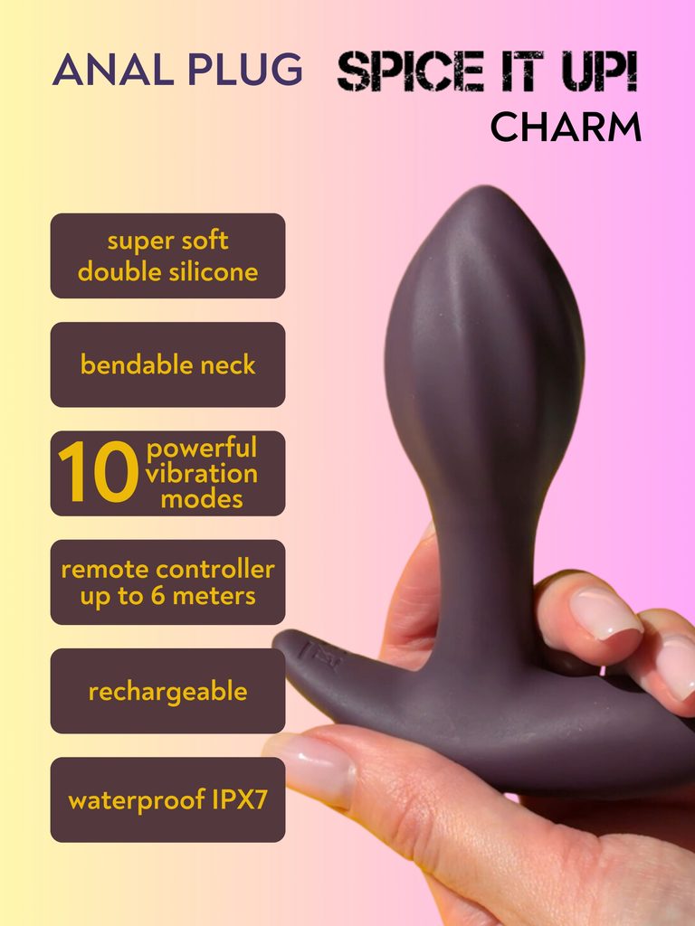 Spice it Up Charm je vodotěsný dobíjecí anální kolík s dálkovým ovládáním, který nabízí skvělý zážitek. S výkonným motorem a 10 různými vibračními režimy, naprosto flexibilním krkem a výrazným reliéfem na povrchu je ideální pro všechny uživatele. Díky bezpečné základně je velmi pohodlný i při dlouhodobém nošení. Kolík je vyroben z měkkého hypoalergenního silikonu.
